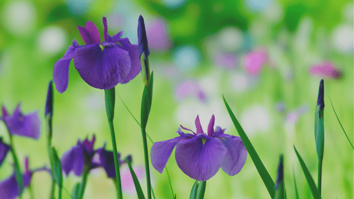 胸の思いも晴れて逢う日の花あやめ 色も匂いも紫に 池の水面に雲は流れて 花は流れて ながれながれて波の間にまに風かおる