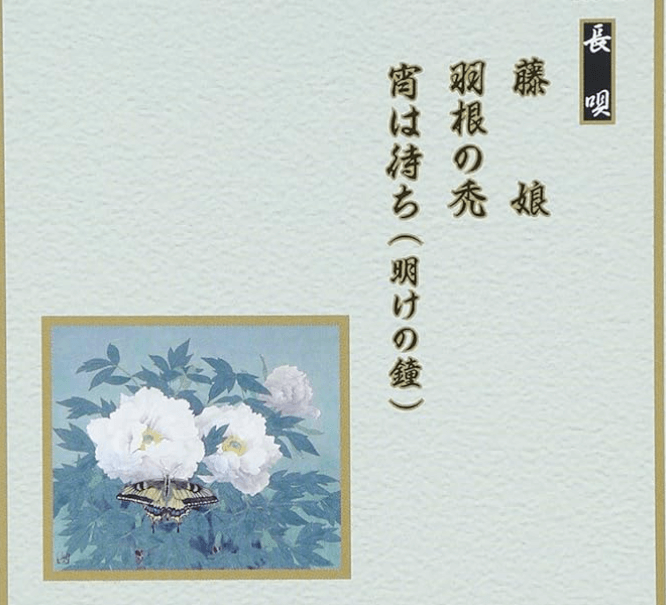 | 大道具 | 中央に松の大木、藤の花を吊り舞台面まで垂らす |