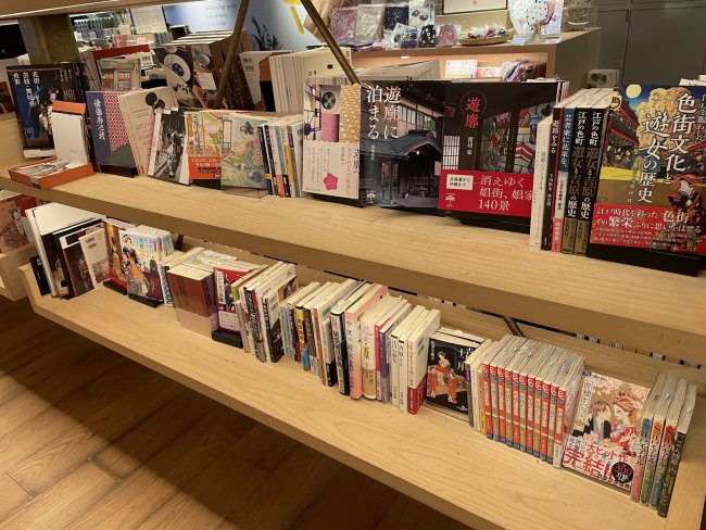 こちらも日本舞踊とは切っては切れない「遊郭」コーナーです。なかなか一般の書店では見つけられませんね。旧遊郭街の写真集などノスタルジーをそそられます。遊郭を舞台にしたマンガもありました。