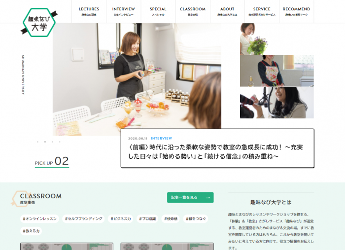 「趣味なび大学」では教室運営に役立つ情報や先生インタビューなどが発信されている