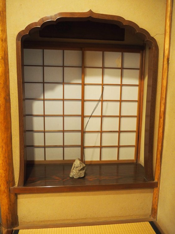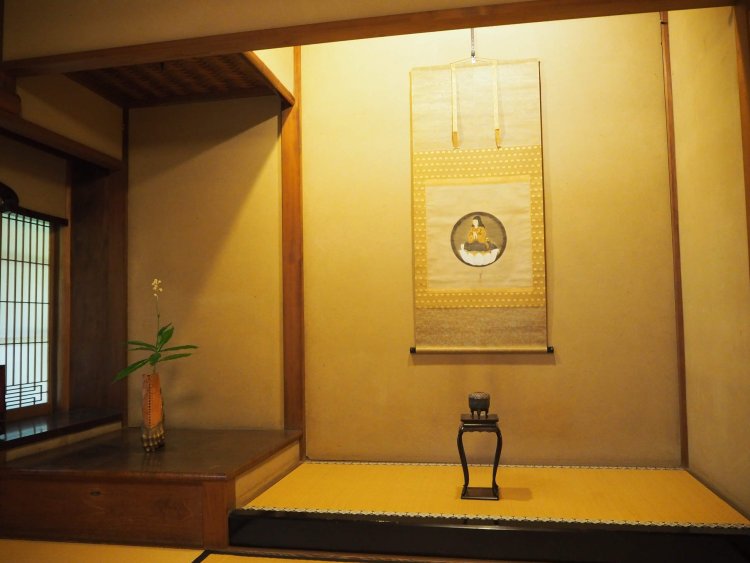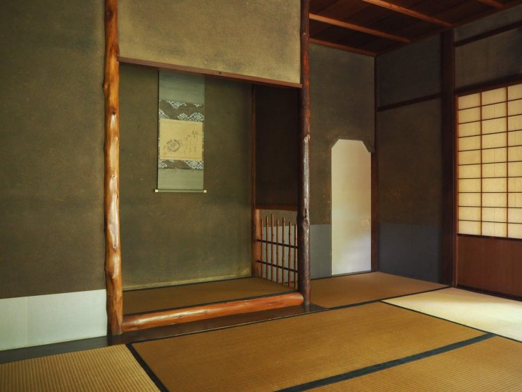 広間の奥には二つ目の茶室、六畳の「有斐斎(ゆうひさい)」があります。床の間の墨跡窓(軸が見やすいよう明り取り用に設けられた窓)は付書院風に張り出しているなど、工夫が凝らされています。